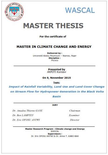 However, the graphical representation of the observed and the simulated flows during validation revealed that there was a delay in peak flows starting from 2008. It was assumed this effect may be due to the Bui reservoir construction. To confirm the hypothesis, the model performance was tested for a period prior to the Bui dam construction. This second calibration was performed for the period 1990-1995 and validated for the period 1996-2000. The calibration was qualified as very good (NS = ii 0.9 and R2 = 0.82) and validation as good (NS = 0.7 and R2 = 0.85). The graphical representation of the observed and the simulated flows during calibration and validation do not show important delay in the peak flows proving that the construction of the Bui dam may effectively affect the dynamic of the river system. Changes in seasonal stream ow due to LULC was assessed by defining dry season (February, March and April) and wet season (August, September and October). The results showed that from year 2000 to year 2013, the dry season discharge has increased by 6% whereas the discharge of wet season has increased by 1%. The changes in stream flows components such us surface run-off (SURF_Q), lateral ow (LAT_Q) and ground water contribution to stream ow (GW_Q) and also on evapotranspiration (ET) changes due to LULC was evaluated. The results showed that between the year 2000 and 2013, SURF_Q and LAT_Q have respectively increased by 27% and 19% while GW_Q has decreased by 6%. At the same time, ET has increased by 4.59%. The resultant effects is that the water yield to stream ow has increased by 4%. We believe that the overall impacts of rainfall variability and LULC may benefit the Bui hydropower plant.